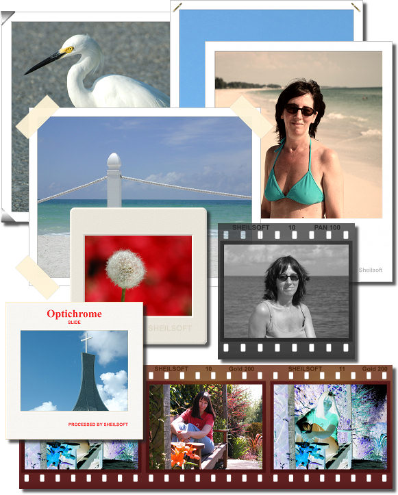 Automatically crops image to 35mm 4:3 ratio. Single negative or Filmstrip styles with Colour, B&W;, and Positive or Negative options. Customize negative text, angle adjustment and drop shadow options.